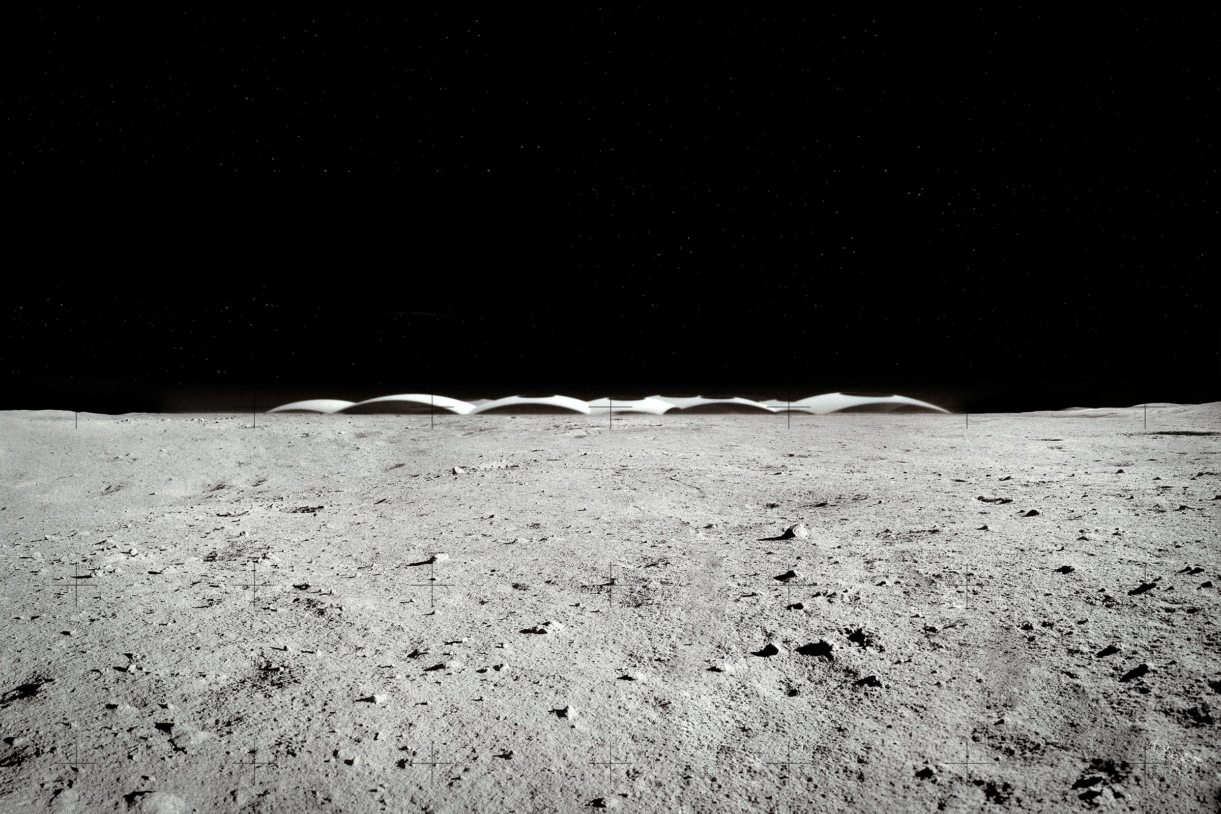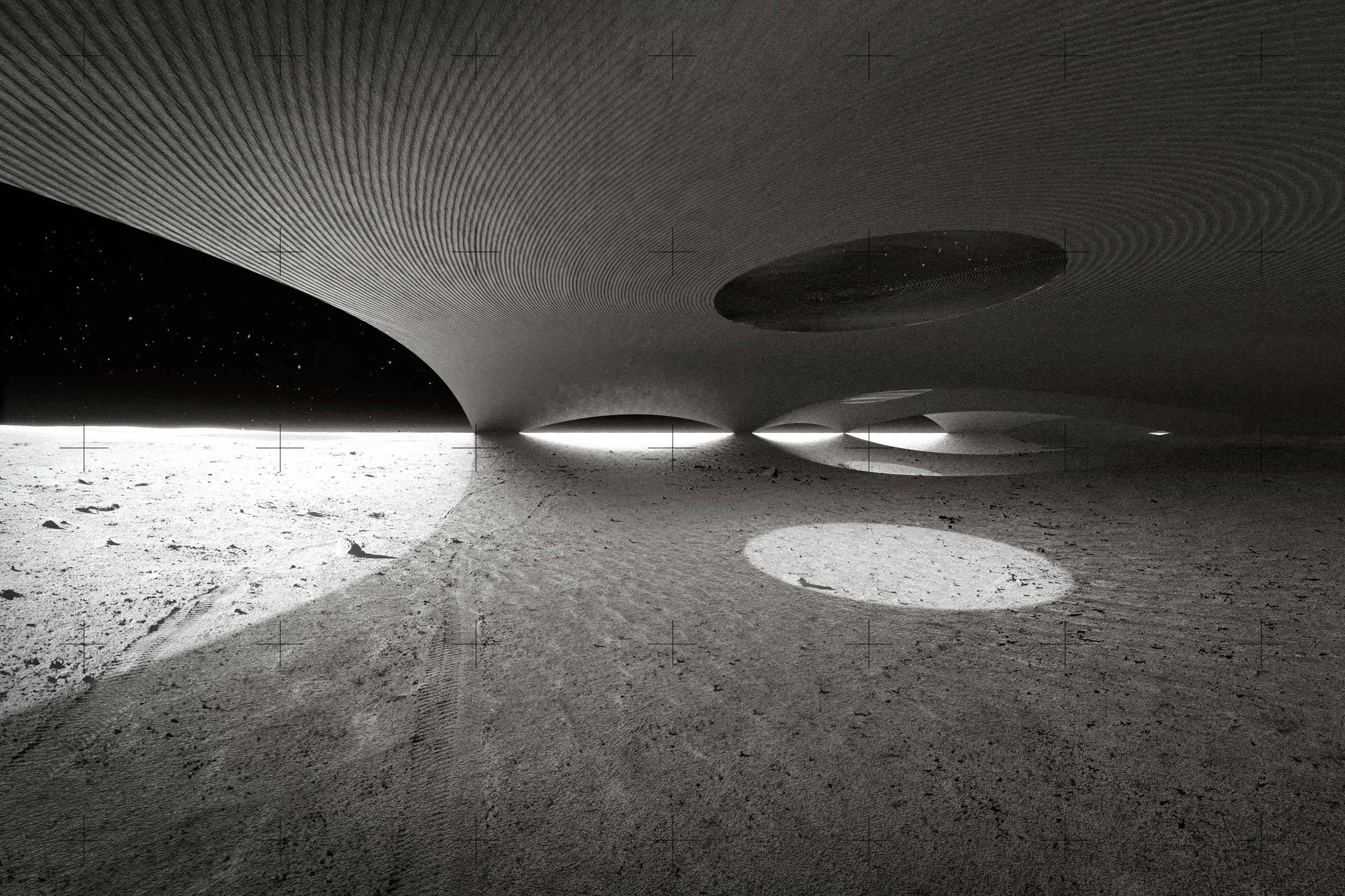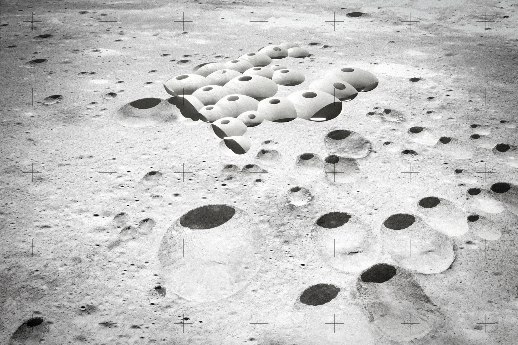Un proyecto para la luna ha de ser ante todo un proyecto paisajístico, que dialogue con su condición perpetua. El carácter más saliente de su paisaje es el color monocromo de su superficie y los miles de cráteres de diversos tamaños, producto del impacto de asteroides a lo largo del tiempo. Para cualquier intervención en la luna proponemos comenzar siempre espejando geometría: la geometría cóncava de los cráteres para materializar sobre los mismos domos convexos y ligeros –de gran eficiencia estructural en la baja gravedad lunar– que definen y protegen espacios interiores. Vistos desde arriba, su sombra será similar a la del cráter original, pero invertida. Su material constructivo se obtendrá del perfilado del fondo del cráter, lo que garantizará un color similar al de la luna. Con tecnología de impresión tridimensional, el polvo lunar obtenido será ido acumulando en estratos horizontales cada vez más cerrados hasta cubrir completamente el cráter; o bien dejando cráteres de tamaño y posición variable en función de necesidades específicas.
