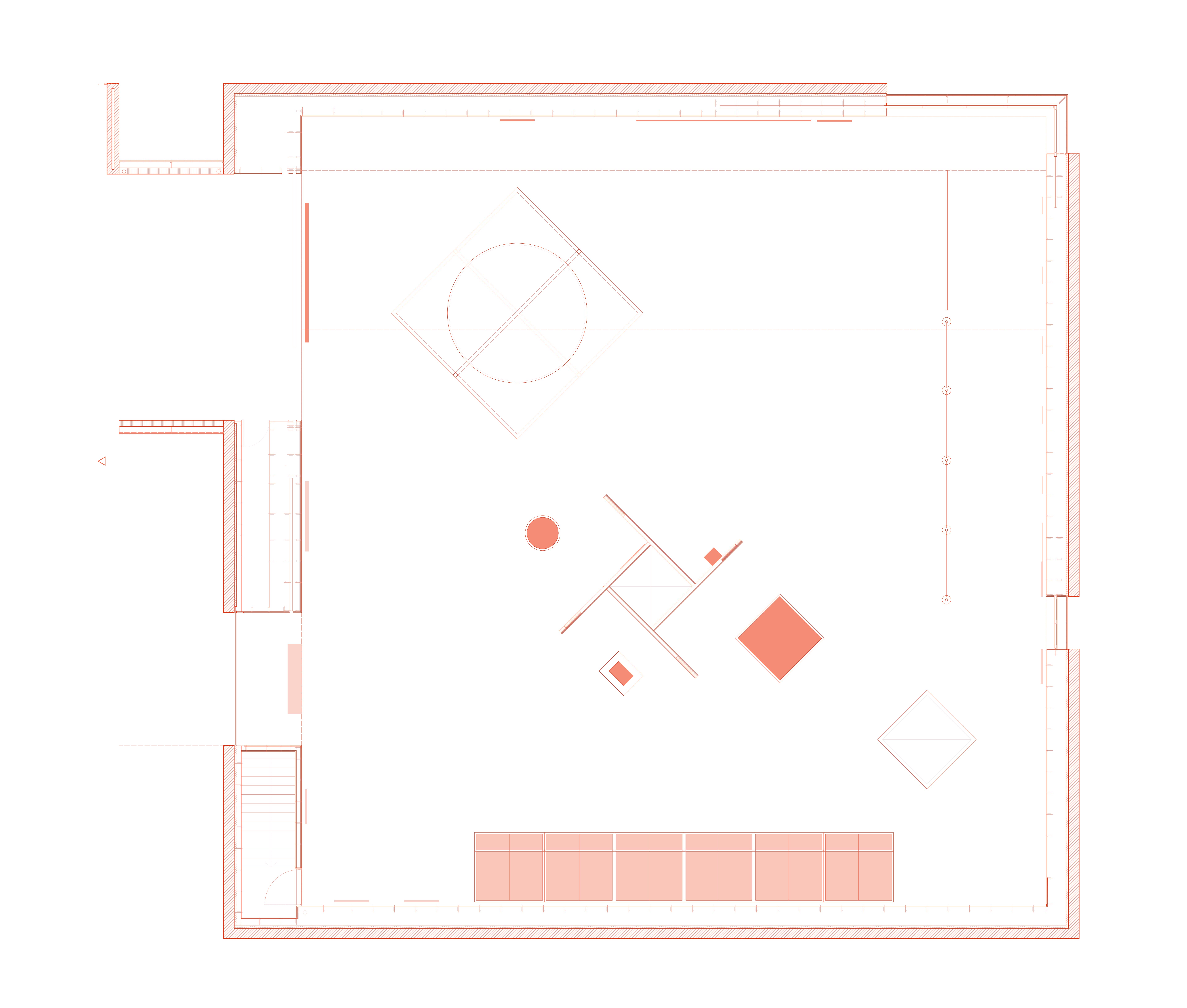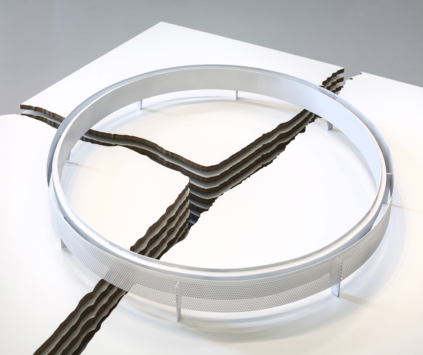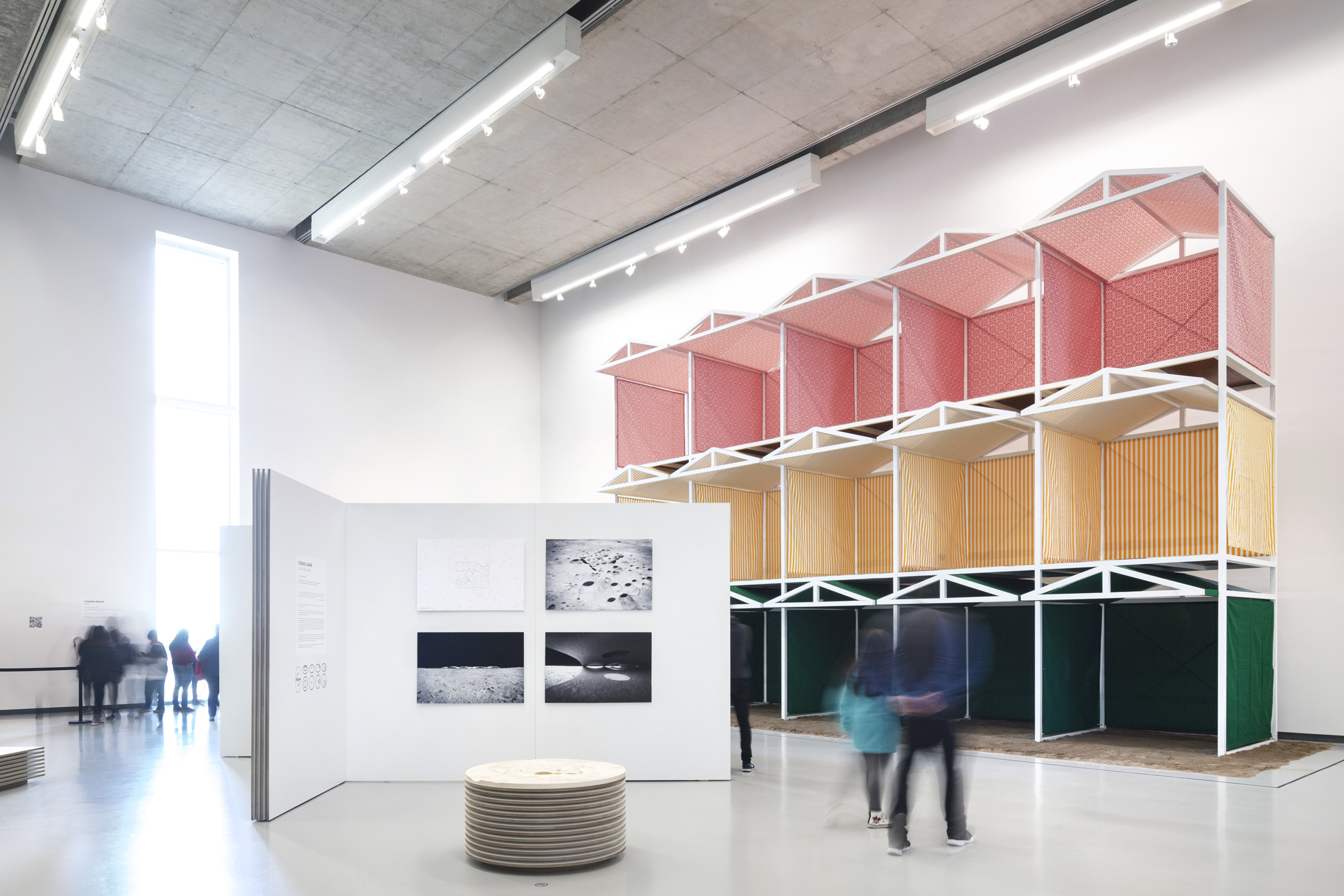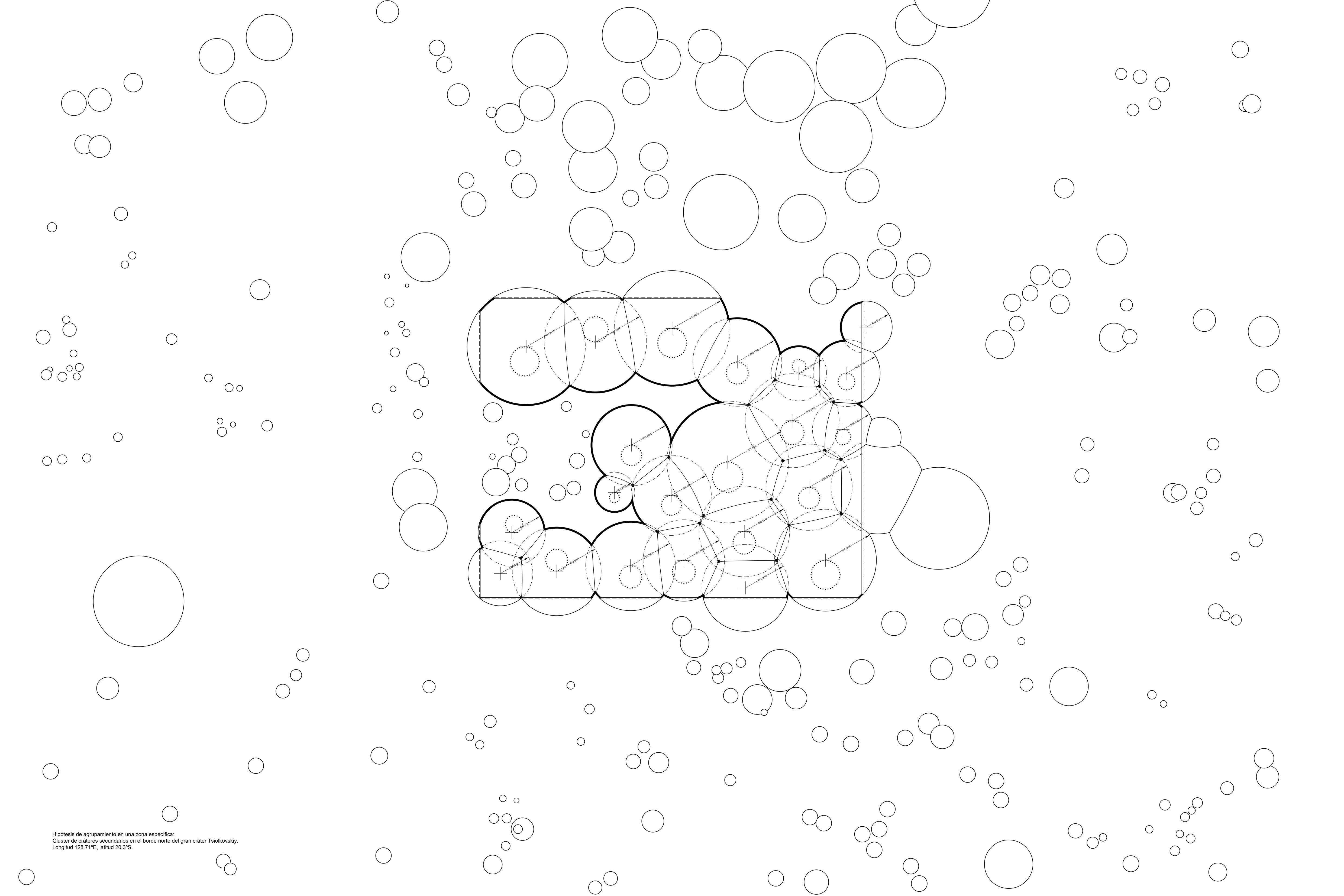 Un proyecto para la luna ha de ser ante todo un proyecto paisajístico, que dialogue con su condición perpetua. El carácter más saliente de su paisaje es el color monocromo de su superficie y los miles de cráteres de diversos tamaños, producto del impacto de asteroides a lo largo del tiempo. Para cualquier intervención en la luna proponemos comenzar siempre espejando geometría: la geometría cóncava de los cráteres para materializar sobre los mismos domos convexos y ligeros –de gran eficiencia estructural en la baja gravedad lunar– que definen y protegen espacios interiores. Vistos desde arriba, su sombra será similar a la del cráter original, pero invertida. Su material constructivo se obtendrá del perfilado del fondo del cráter, lo que garantizará un color similar al de la luna. Con tecnología de impresión tridimensional, el polvo lunar obtenido será ido acumulando en estratos horizontales cada vez más cerrados hasta cubrir completamente el cráter; o bien dejando cráteres de tamaño y posición variable en función de necesidades específicas.