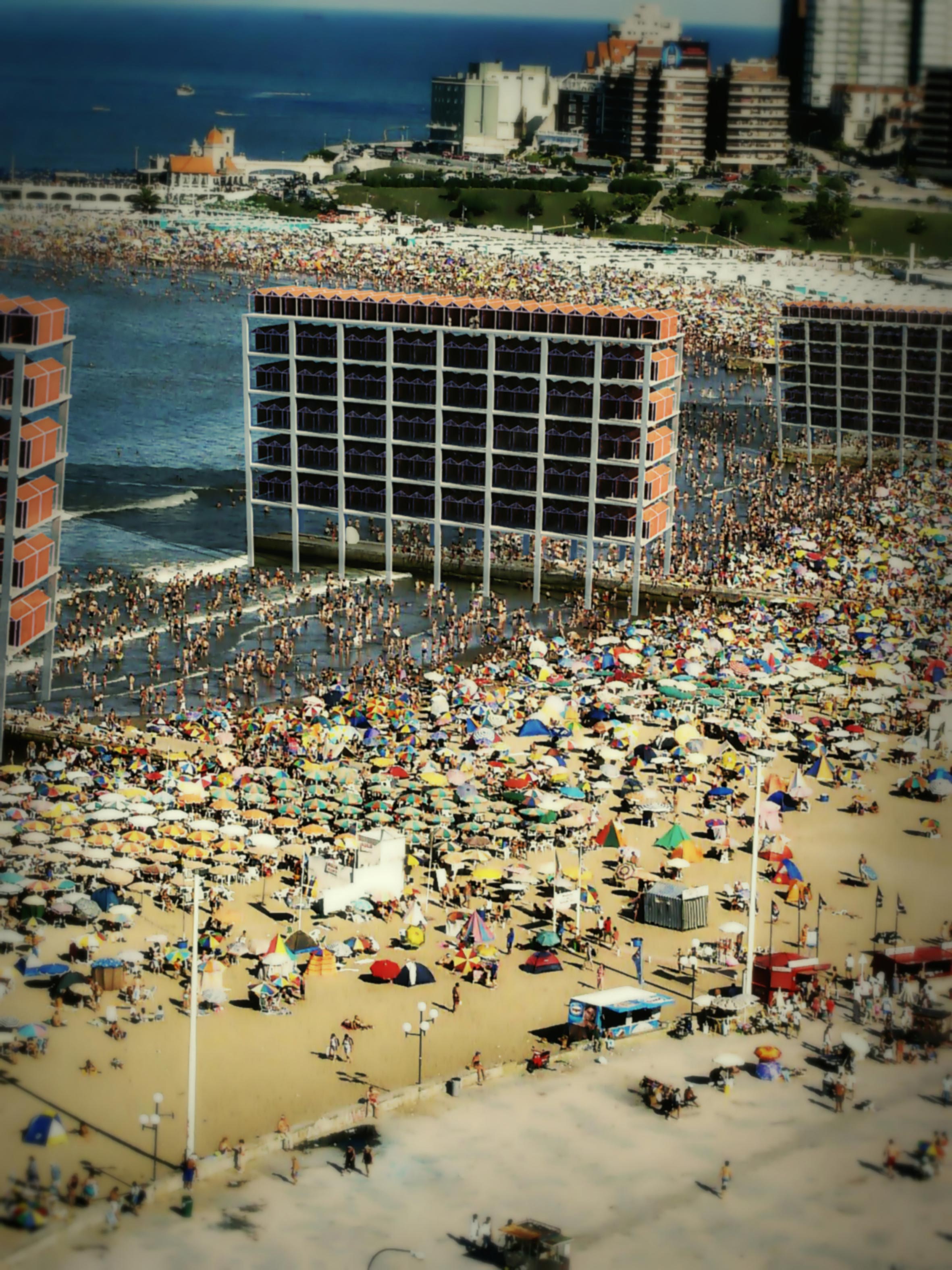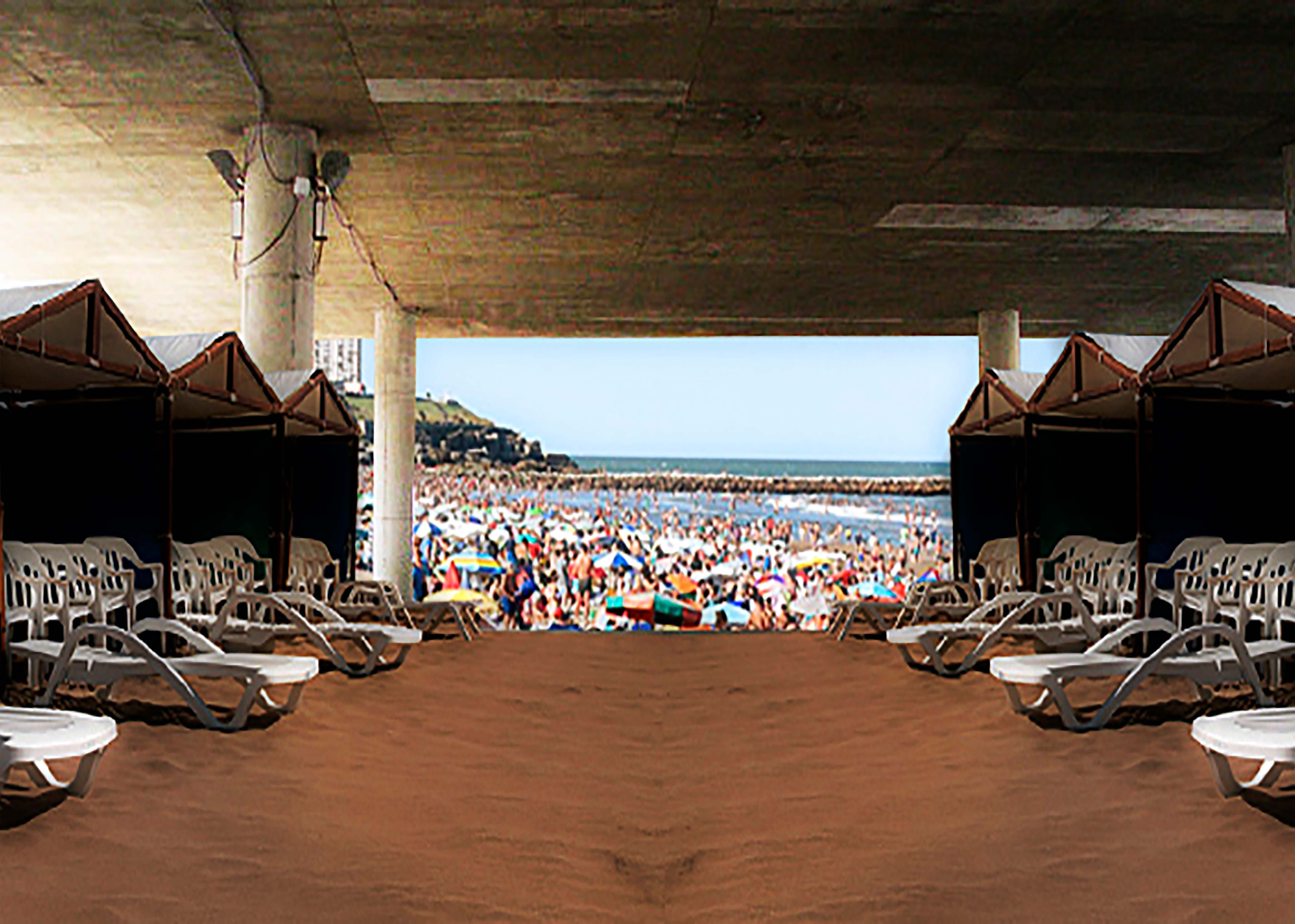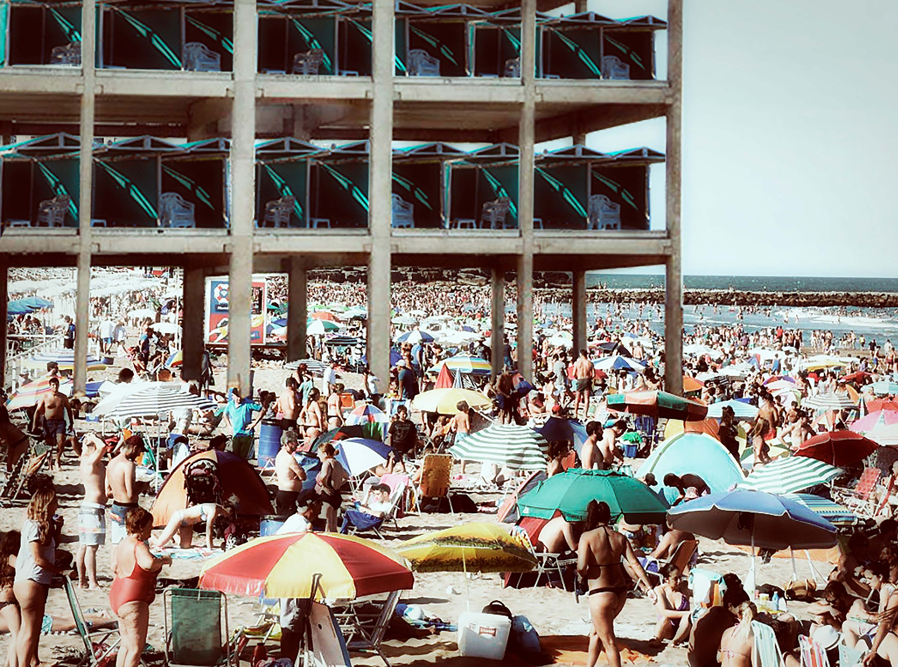 Edificios a metros de la costa. Paradores bolicheros a metros del mar. Recintos privados de suelo arenoso con parcelas marcadas por sogas. Carpas con vecinos en parcelas numeradas y pasillos de circulación. Reposeras de plástico, dos por carpa. ¿Cuánto más puede parecerse a nuestra irremediable manera de estar juntos la ciudad balneario?